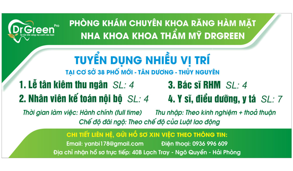 Hệ Thống Nha Khoa DrGreen Tuyển Dụng Nhiều Vị Trí Với nhu cầu tăng cường nhân sự chất lượng, mở rộng hệ thống để phục vụ khách