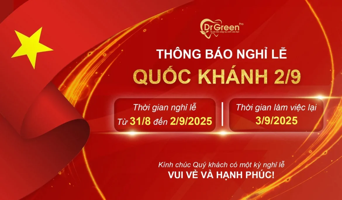Nha Khoa DrGreen xin gửi đến Quý khách hàng thông báo về lịch nghỉ lễ Quốc khánh 2/9. Đây là dịp để toàn thể đội ngũ nghỉ